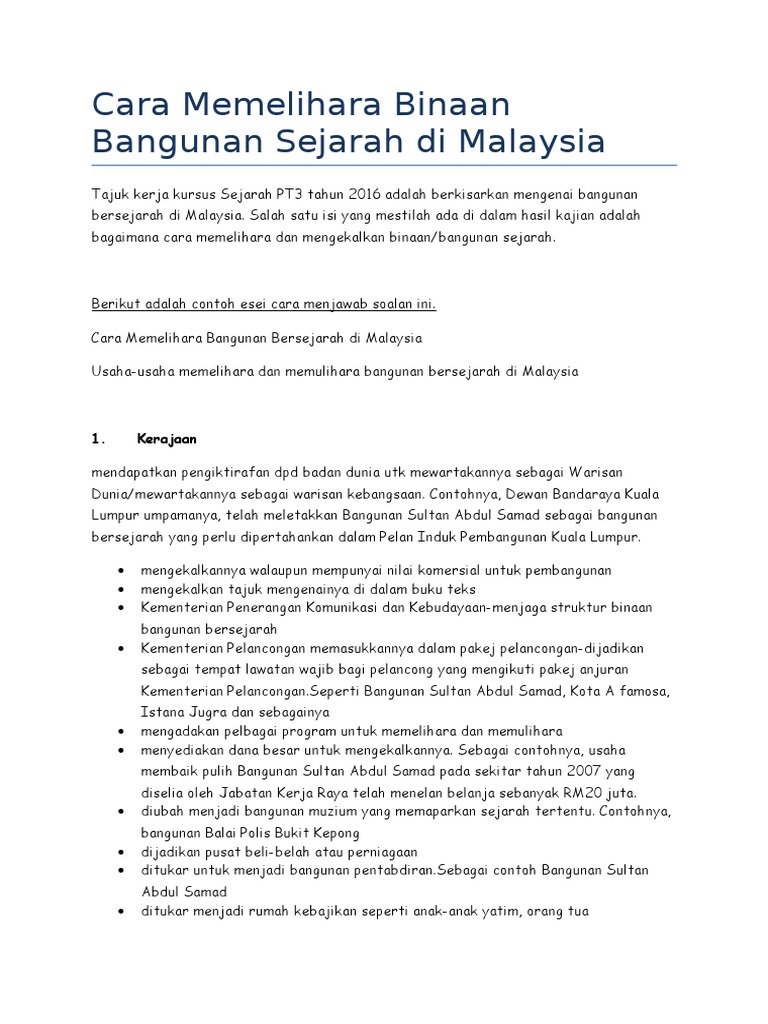 . Bangunan bersejarah merupakan sebuah bangunan yang dibina pada zaman dahulu yang menceritakan evolusi manusia dan memberi nilai sejarah yang berlaku di tanah air kita. Kerja Kursus Sejarah Tingkatan 1. Orang melayu harus Bertanggungjawab memelihara dan memulihara.